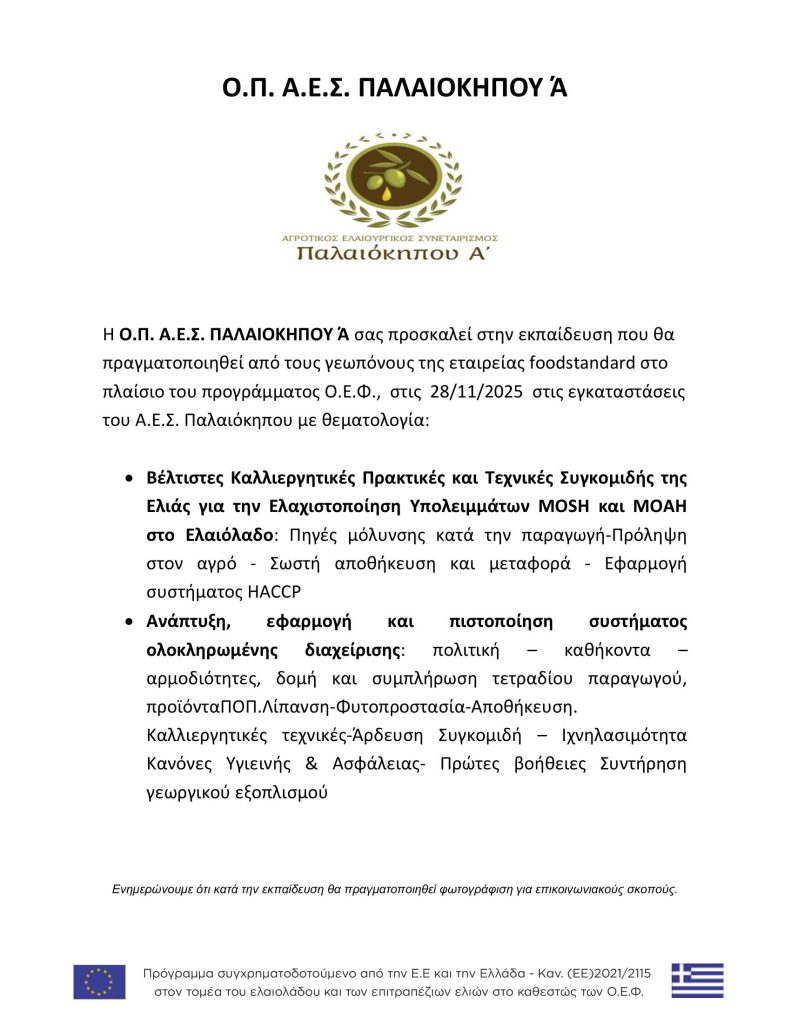 Εκπαίδευση παραγωγών – μελών της Ο.Π. Α.Ε.Σ. Παλαιόκηπου Α΄ στο πλαίσιο του 2ου έτους εφαρμογής του εγκεκριμένου προγράμματος εργασίας Ο.Ε.Φ. περιόδου 2021 – 2022 για τη Δράση Γiii – Διεξαγωγή μαθημάτων κατάρτισης επιτόπου στον αγρό. Η εκπαίδευση θα πραγματοποιηθεί στο Πολυκέντρο Παλαιοκήπου στις 18:00 .